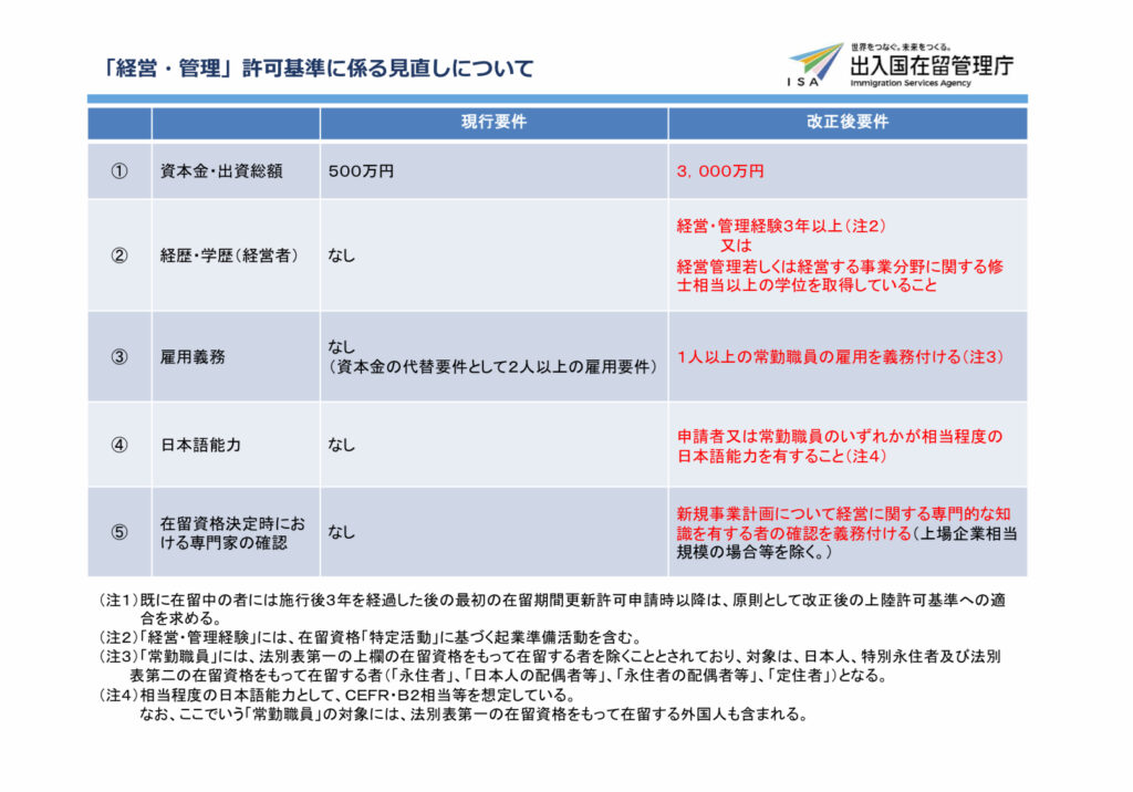 出入国在留管理庁サイト 在留資格「経営・管理」に係る上陸基準省令等の改正について